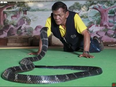 这位农民与眼镜王蛇相斗,并吞食它,以此吸引顾客 泰国俱乐部表演吞食眼镜王蛇...