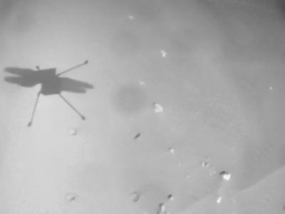 在火星沙漠上的美国国家航空航天局“机智”直升机,其桨叶在插图中清晰可见。(图片...