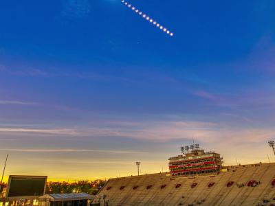 2024年4月8日,美国国家航空航天局克利夫兰格伦研究中心飞机库上空日全食的合成图像...