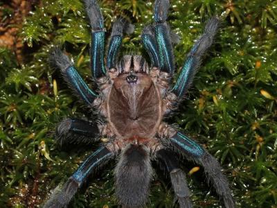 新种蜘蛛的雌性有着亮蓝色的腿,雄性则是苔藓般的褐色。 PHOTOGRAPH BY RANIL P. N...