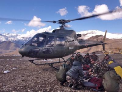 尼泊尔士兵将伤者送上直升机 救援人员将伤者送下山 直升机到山上进行救援工...
