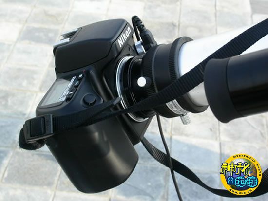 2)、直焦法相对来说麻烦一些。要用这种方法必须使用数码单反相机,这种相机的镜头可以拆卸,将其拆掉后,再把望远镜的目镜拿掉,然后将数码单反的机身和望远镜的主镜通过转接环接到一起,这就相当于用望远镜直接当相机的镜头。这种方法的好处是经过的光学系统最少最简单,因此能保证质量最好的成像——虽然这样得到的图像不如放大法的大。直焦法最关键的装置就是连接相机和望远镜的接环。这种接环在天文器材专营店可以买到,不过要注意相机的品牌,不同品牌的数码单反其接口型号是不一样的;也要注意望远镜目镜端口多大,一般而言目前常见的目镜端接口的大小是1.25英寸,也有一些好点的望远镜使用2英寸的大接口,而比较老型号的小望远镜其接口可能是1英寸的小接口。
