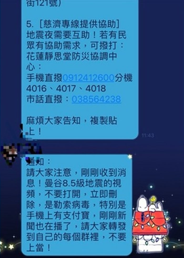有黑客在LINE发布“曼谷8.5级地震”的影片及连结后,其后有网友辟谣,指该影片是勒索病毒,提醒不要打开及立即删除,尤其手机安装了支付宝。不过,有网络工程师解释指,在LINE直接可以看、会播放的图片和影片基本上完全不会有毒,除非收到的是含有连结的版本,就小心有毒或是钓鱼网站。
