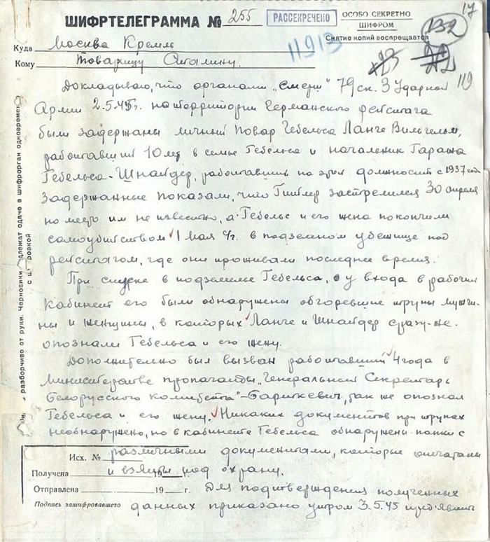 希特勒于1945年4月30日苏军包围柏林时自杀身亡。在朱可夫的报告中提到了第三突击集团军下属的第79步兵军中的苏联国防人民委员部反间谍总局机关获得的信息,这些信息来自被俘的第三帝国高级工作人员的证词。
