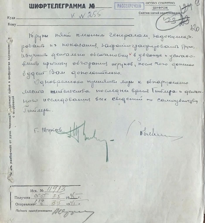朱可夫称,为确认得到的信息,5月3日下达了“将尸体交予5名被俘将军并记录其证词、对尸体拍照、细查避难所内情况、确定尸体焚烧原因的命令,并在此后进一步向您呈交报告。”