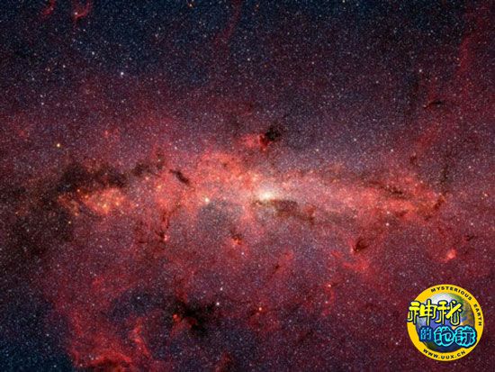 这张由斯皮策太空望远镜捕捉的红外图像显示的是银河系中心密集的恒星。事实上,这张图片是由斯皮策太空望远镜拍摄的多张较小照片合成而来的。年龄更长、温度较低的恒星显示蓝色,而红色星际尘埃云则聚集着许多年龄较轻、更炽热的恒星。