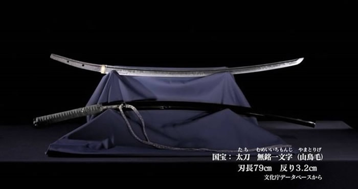 无铭一文字刃长79厘米,弯度超过3厘米,重1.06公斤。由于复杂的刃纹神似山鸟羽毛,因此别号为“山鸟毛”,于1952年由文部省列为文化财国宝。无铭一文字由长船町地区的刀匠于镰仓时代中期铸造,相传是关东管领、“越后之虎”上杉谦信的爱刀,他死后由养子上杉景胜继承,其后成为私人收藏。