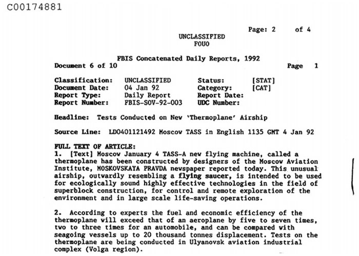 网站始创人格林沃尔德(John Greenewald Jr)购得一张CIA光碟后,将文件上载网站。多份合共长达2,700页的文件提到俄罗斯的离奇事件,包括当地一处城镇发生不明爆炸,以及阿塞拜疆首都巴库(Baku)上空出现UFO等。