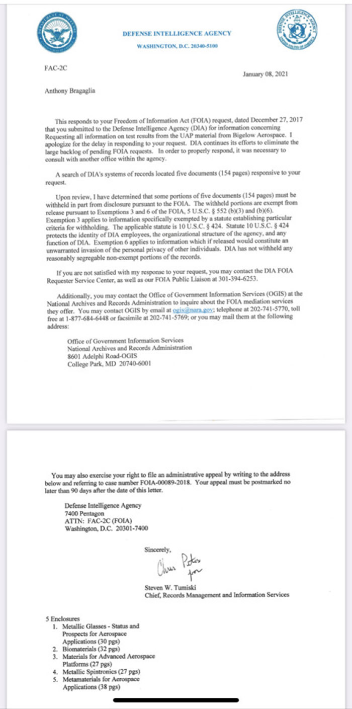 综合《太阳报》、《每日邮报》报导,布拉加利亚2017年根据《资讯自由法》(FOIA),要求国防情报局公布政府与其承包商掌握的UFO物质详细资料与实验结果,包括「国防部人员发现的碎片、漂浮物、脱落物件或坠毁残骸」,并在3年多后的最近获得回应。