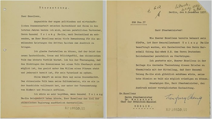 官网在介绍文指出,相关的求援信件高达17封,主要出自于德国外交部、帝国总理府、中华民国大使馆与相关办公单位之手,甚至还有先前从未曝光过的,蒋介石写给希特勒信件的德文翻译版本,希望能委托希特勒出手干预与日本方面的谈判,来换取中国与日本条件较好的和平协议,不最后却被希特勒无情拒绝。