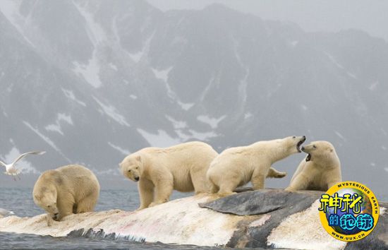 4只体型巨大的雄性北极熊为了争抢鲸鱼尸体“刀兵相见”