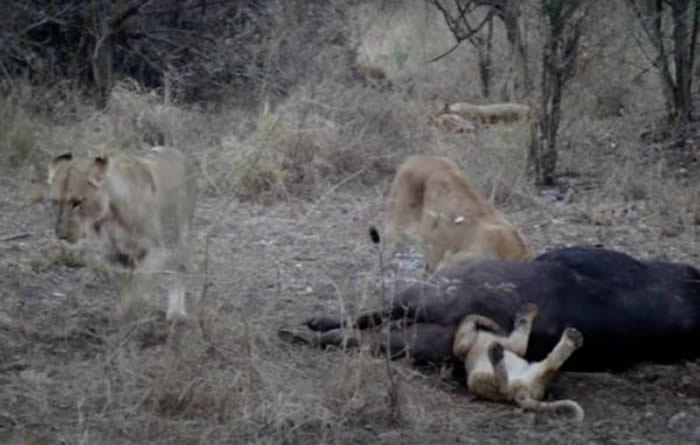 影片中可见,18头狮子所组成的狮群成功猎杀2头非洲水牛,当大狮子们正在享用美食时,一只小幼狮不知道是出自于好玩,还是想要食用内脏,竟然将自己的头颅塞进水牛的肛门内,更不幸卡住拔不出来。一开始小狮子的前肢按在水牛的屁股上不断挣扎,可惜还是未能将卡住的头拔出来,而一旁的母狮群见状却没有要帮助幼狮的意思,无动于衷的趴在不远处休息。