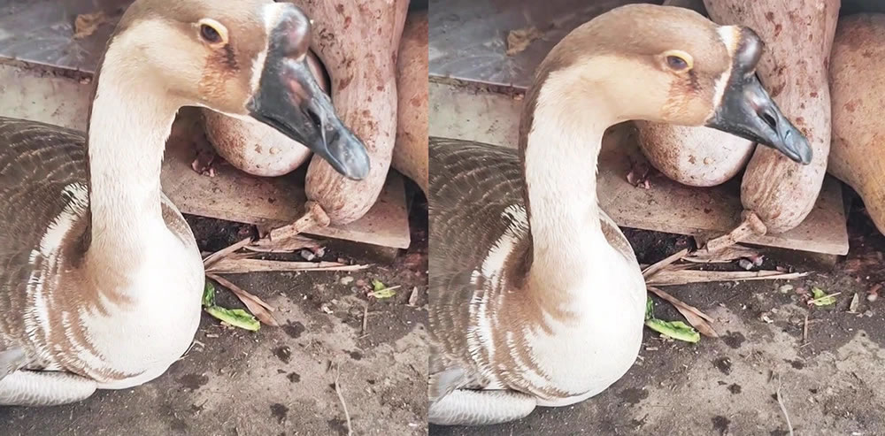 鹅疑似察觉到主人要杀它,竟一脸委屈地蹲坐在地上不断掉泪,泥地上甚至被泪水打湿,出现一点一点的水痕,让男子看了相当吃惊,急忙叫妻子一起过来看,男子的妻子原本不相信,直到走出来查看后,才发现鹅是真的在哭,整个过程都被他用手机拍下。