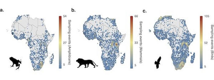 为了估计非洲每100公里x 100公里网格单元(进行此类分析的标准方法)的探险次数,我们统计了至少有一次采集涉及两栖动物、哺乳动物或鸟类的年份。因此,例如,值为5,表明科学家在五个不同的年份中进行了收集。