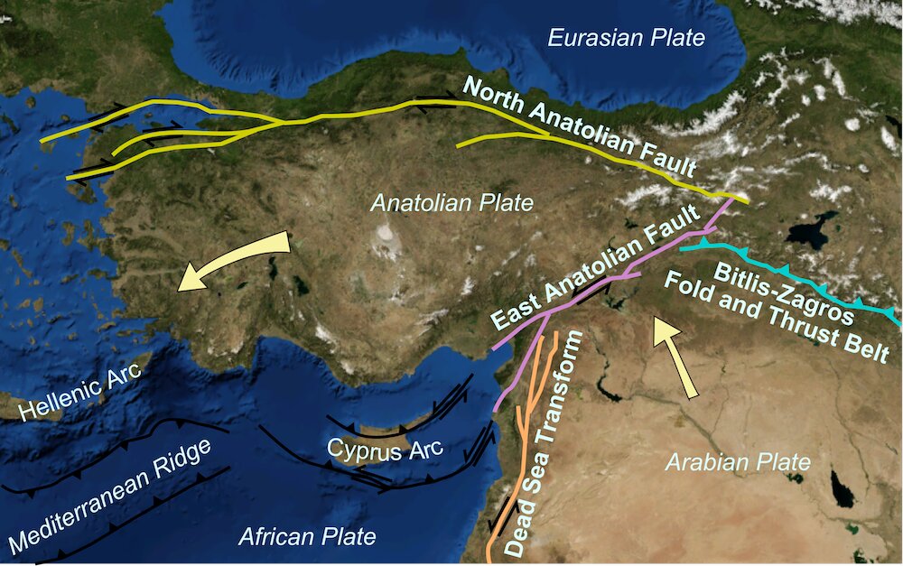 土耳其的这一地区容易发生地震,因为它位于构成地壳的三个构造板块的交汇处:安纳托利亚板块、阿拉伯板块和非洲板块。阿拉伯正在向北移动进入欧洲,导致安纳托利亚板块(土耳其所在的板块)向西移动。