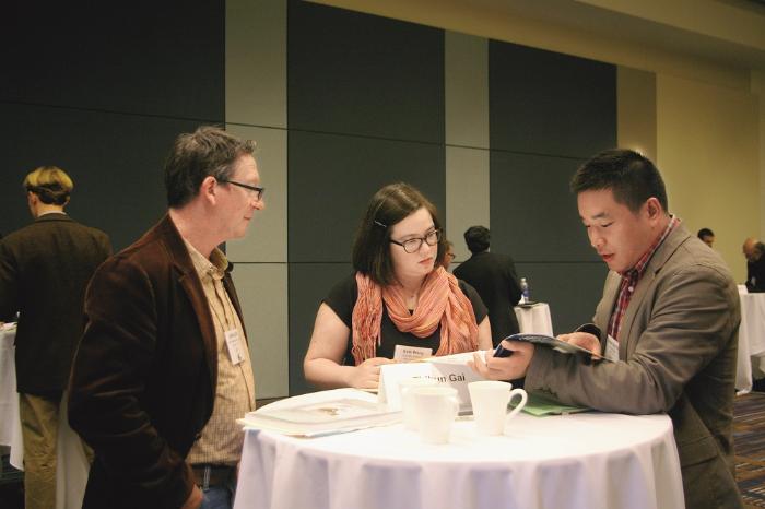 2012年,盖志琨(右)在美国罗利国际古脊椎动物学会的新闻发布会上接受媒体采访