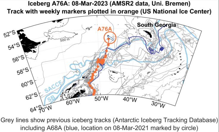 另一座正在消失的巨大冰山是A76A。这块巨大的冰块是A76冰山的一部分,它在2021年5月中旬从菲尔希纳-罗纳冰架上脱落后开始了生命。当它向北行进时,A76断成三块,其中最大的一块叫做A76A。它长135公里,宽25公里,是地球上最大的漂浮冰山——是大伦敦的两倍大——正向南乔治亚岛移动。