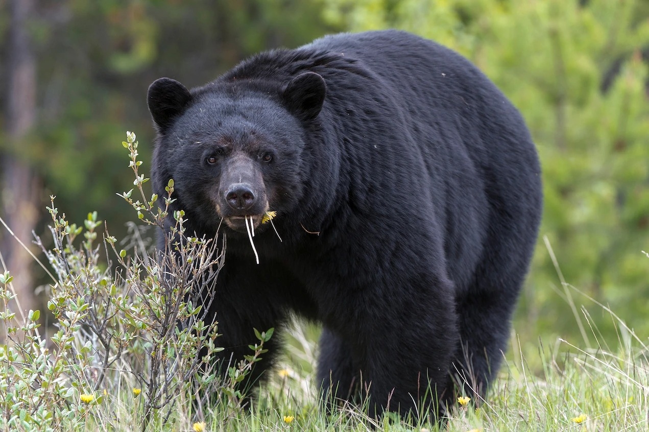 跟电影不一样的是,现实世界中的那只古柯碱熊并没有陷入摄入古柯碱所造成的暴走状态,但它确实吃下了致死剂量的古柯碱,那是走私客留在森林里的。图中是正在吃蒲公英的美洲黑熊。PHOTOGRAPH BY BARRETT HEDGES,NAT GEO IMAGE COLLECTION