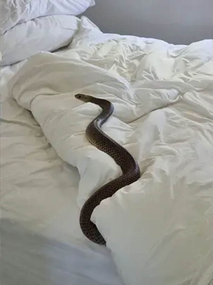 (神秘的地球uux.cn)据ETtoday(记者 李振慧):澳洲一名女子进卧室打算更换床单时,竟然在床上发现一条近2公尺的巨蛇正在蠕动,吓得她赶紧打电话向捕蛇专家求救,事后得知蛇竟然是有世界第二毒蛇称号的东部棕蛇(Eastern Brown Snake),庆幸自己逃过一劫。