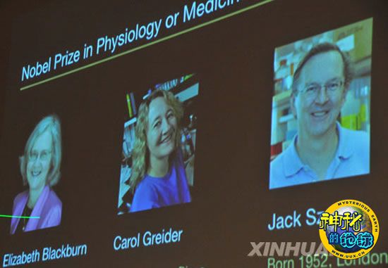 10月5日,在瑞典首都斯德哥尔摩举行的新闻发布会上,卡罗林斯卡医学院诺贝尔生理学或医学奖评选委员会展示2009年诺贝尔生理学或医学奖3位得主(从左至右)伊丽莎白·布莱克本、卡萝尔·格雷德和杰克·绍斯塔克的照片。卡罗林斯卡医学院当日宣布,将2009年诺贝尔生理学或医学奖授予美国科学家伊丽莎白·布莱克本、卡萝尔·格雷德和杰克·绍斯塔克,以表彰他们“发现端粒和端粒酶是如何保护染色体的”。