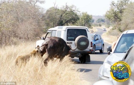 这位目击者说:“母狮的后腿上有伤,从这种情况来看,它之前好像就对那头水牛发动过袭击,并在激战过程中受伤。母狮咬着水牛的背死死不放,那头水牛开始喘粗气,它带着背上的母狮艰难前行,希望能狮口脱险。”水牛冲上马路,撞在一辆车的后保险杠上。那只狮子再也坚持不住,只好无奈的从母牛背上跳下来。