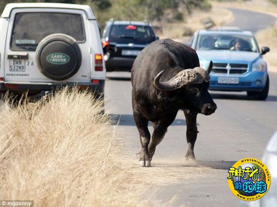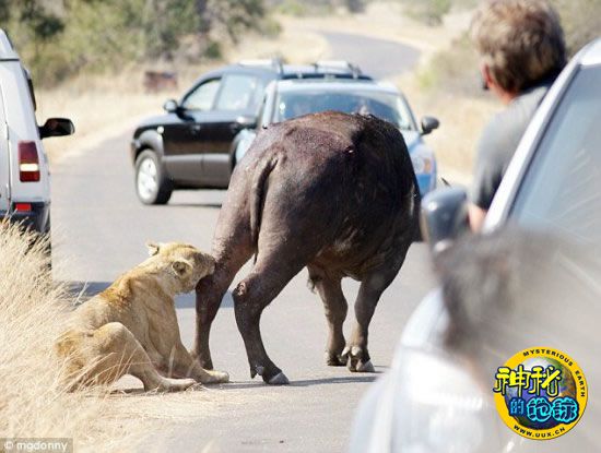 美格多尼说:“水牛仍呆在马路上,它的角撞在另一辆车的前保险杠上。那两只雄狮向马路这边走来,但是它们并不打算帮母狮一把,而是舒服地躺在较远的地方,耐心观战。过了一段时间后,母狮又对水牛发动两次袭击,希望把它放倒,但是这些尝试都以失败而告终。”这头水牛和周围的游客非常幸运,由于两只野兽的个头相差太悬殊,母狮很难征服那头水牛,最后它放开水牛,迈着轻快的步伐消失在茫茫原野上。