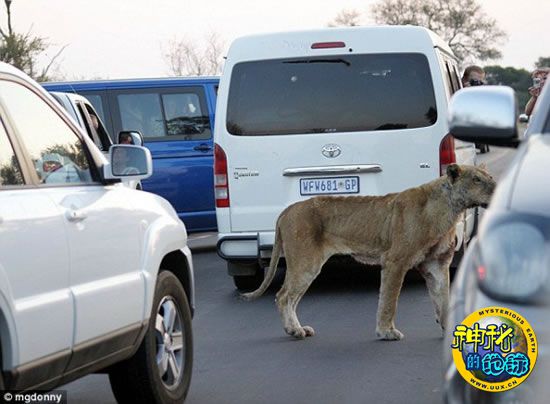 跑上公路的母狮让汽车里的游客不敢探出车窗