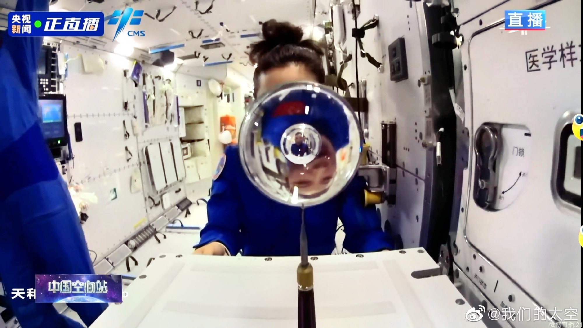 一个水球中的气泡,创造了中国宇航员王亚平在天宫空间站的正面和负面图像。(图片来源:uux.cn/央视网)