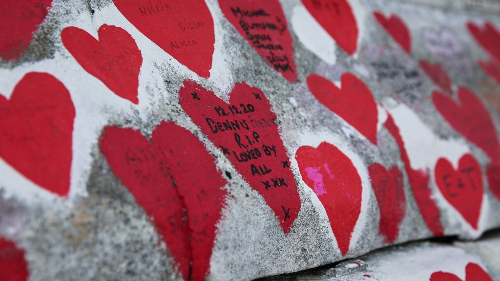 伦敦市中心国家新冠肺炎纪念墙上的彩绘心形和信息特写(图片来源:uux.cn/SOPA Images/Getty Images撰稿人)
