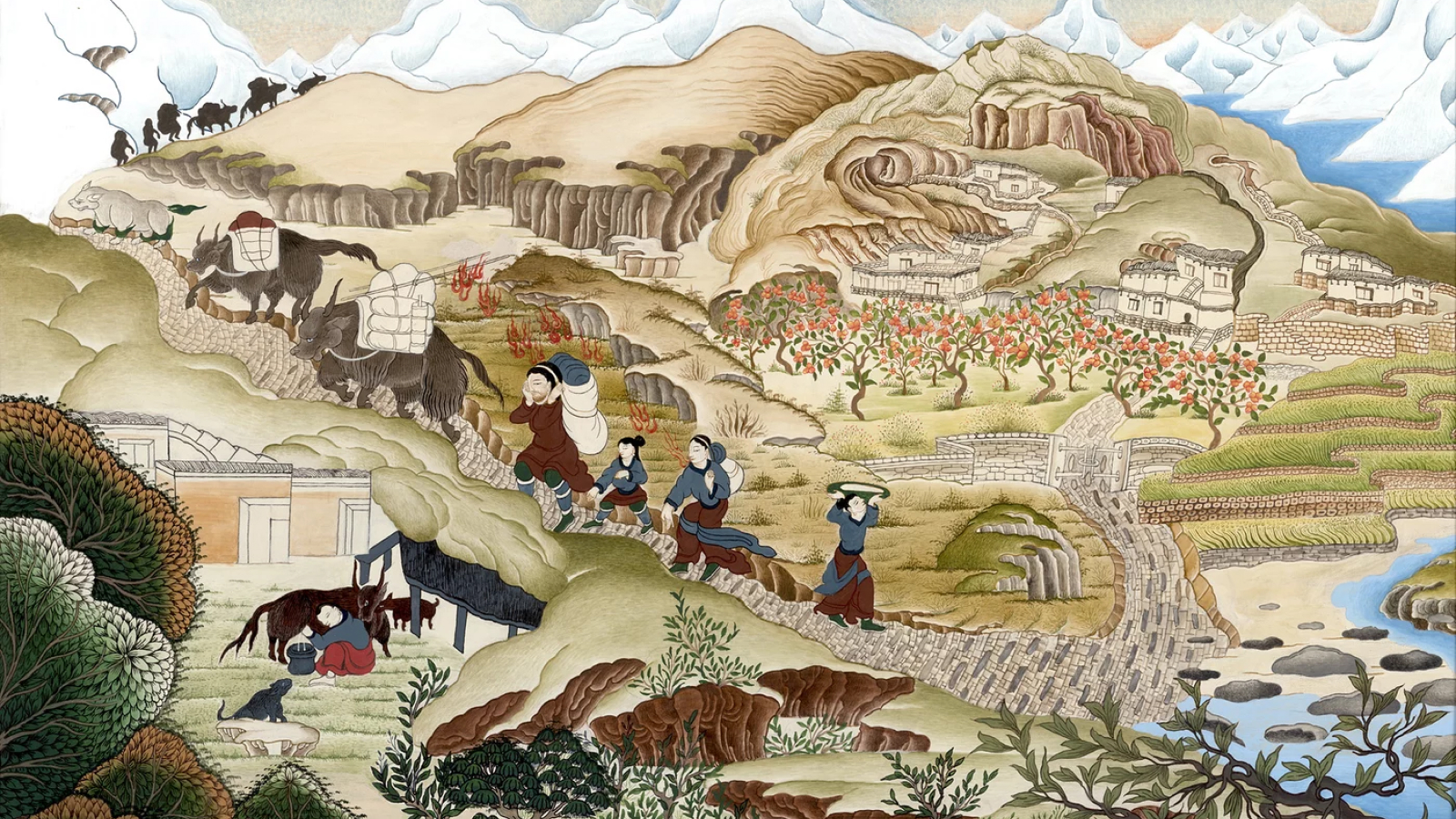 一幅艺术家的重建作品,描绘了一个穿着长袍的人背着一大袋货物,带领驮畜上山。这是对一名长途交易员的描述,研究人员对其遗体进行了分析。令人惊讶的是,科学家在尼泊尔乔霍帕尼一个寒冷高海拔地区的居民身上发现了疟疾的证据。研究小组怀疑,这名长途交易员是在一个温暖低洼的地区感染这种疾病的。(图片来源:uux.cn/Purna Lama,Boudha Stupa Thanka中心,尼泊尔加德满都)