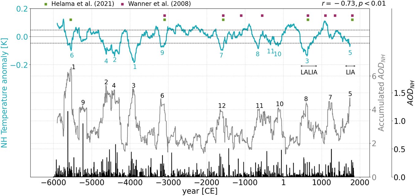 北半球全球平均表面温度(蓝绿色)和气溶胶光学深度(灰色)的200年移动平均值。由气溶胶冷却产生的冷却事件按冷却程度的顺序编号为1至11。LALIA是古代小冰河时代的晚期。来源:uux.cn通讯地球与环境(2024)。DOI:10.1038/s43247-024-01380-0