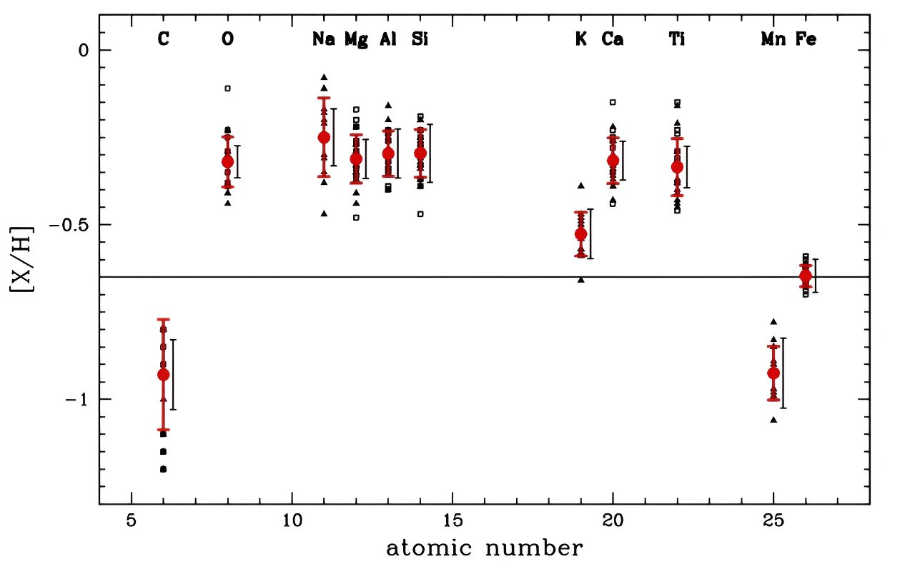 根据这一恒星样本,天文学家发现Terzan 6的金属丰度约为-0.65 dex,并且在铁中没有表现出任何明显的内在扩散。结果表明,钙、硅、镁、钛、氧、铝和钠的丰度比相对于相应的太阳值提高了约0.3–0.4 dex。然而,钾的丰度比仅略微提高了平均0.11 dex,而碳和锰则减少了。