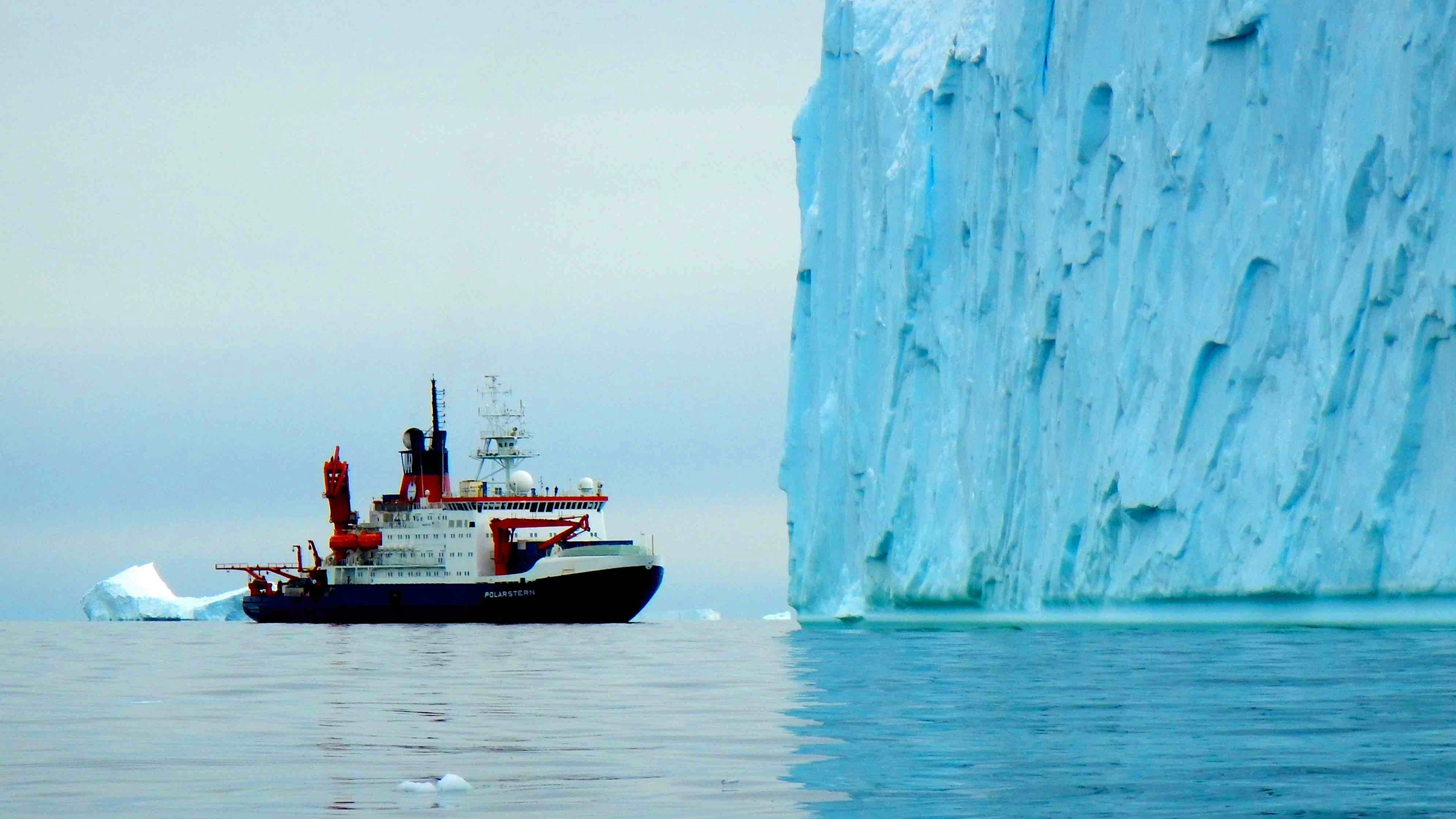 一艘研究破冰船Polarstern在阿蒙森海的一座巨大冰山前。这艘船上的研究人员发现了曾经流经南极洲西部的一条大河的证据。(图片来源:uux.cn/Johann Klages)