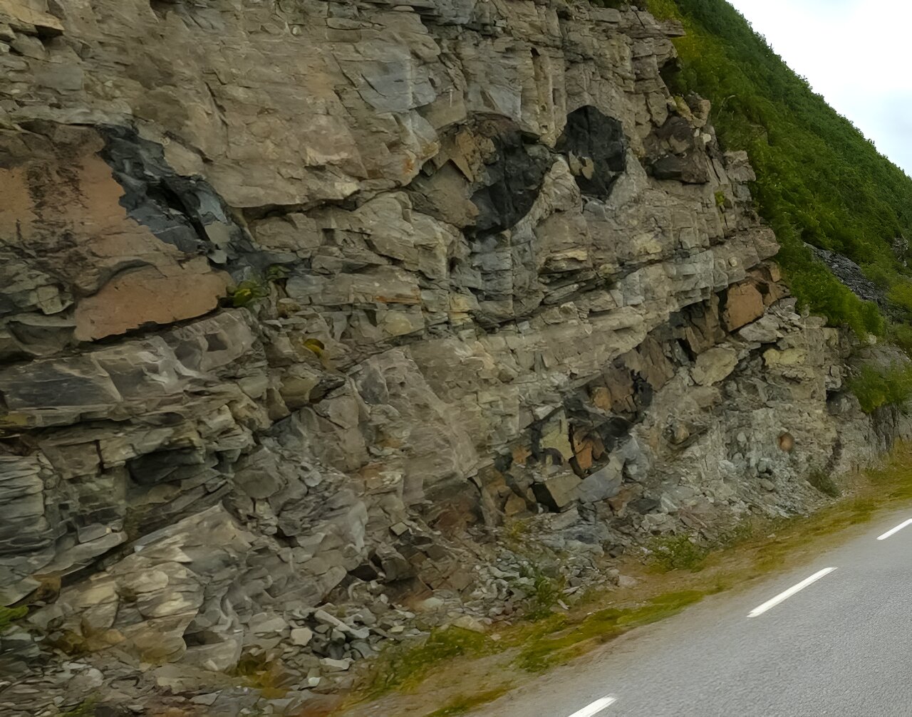 挪威的堤坝切入较老的层状砂岩。来源:uux.cn/Cato Andersen/Mapillary,CC BY-SA