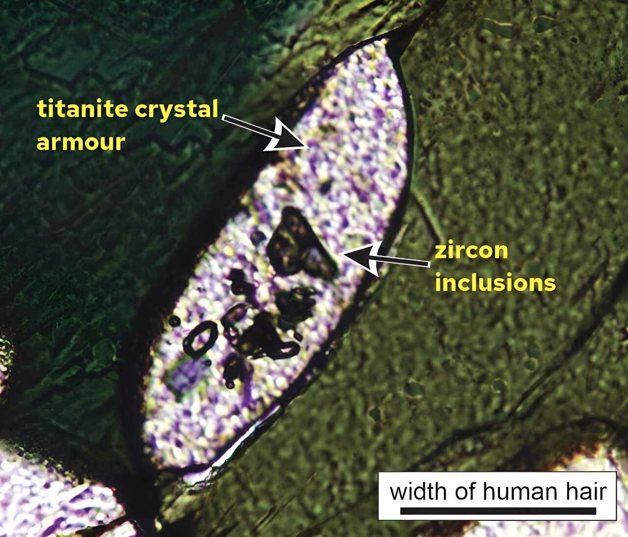钛铁矿颗粒的显微镜图像,锆石晶体被困在里面并受到保护。图片右下方的比例尺为100微米,大约相当于一根头发的宽度。来源:uux.cn改编自《通讯地球与环境》(2024)。DOI:10.1038/s43247-024-01469-6
