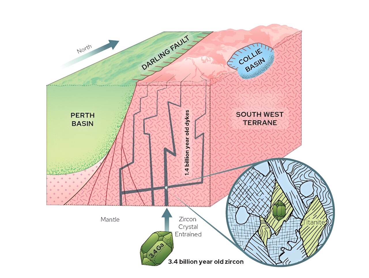 珀斯以南地壳的横截面显示,堤坝从深处采集了34亿年前的锆石,并将其带到了地表。插图放大显示了这种古老锆石被矿物钛酸盐屏蔽的盔甲。来源:uux.cn通讯地球与环境(2024)。DOI:10.1038/s43247-024-01469-6
