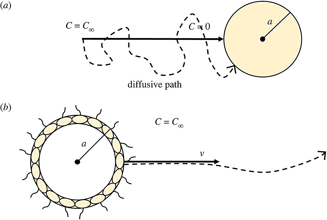 (a) 无运动扩散细胞。球形细胞吸收细胞表面的所有营养物质(C=0),导致化学资源(如葡萄糖)从远处向细胞扩散(C=C∞)。(b) 动力性choanoblastula。该生物是中空的,外径为a,以v的速度游动。该生物的运动性意味着它相对于猎物以弹道方式游动。资源集中假定为常数(C=C∞)。资料来源:uux.cn英国皇家学会学报B:生物科学(2024)。DOI:10.1098/rspb.2023.2767