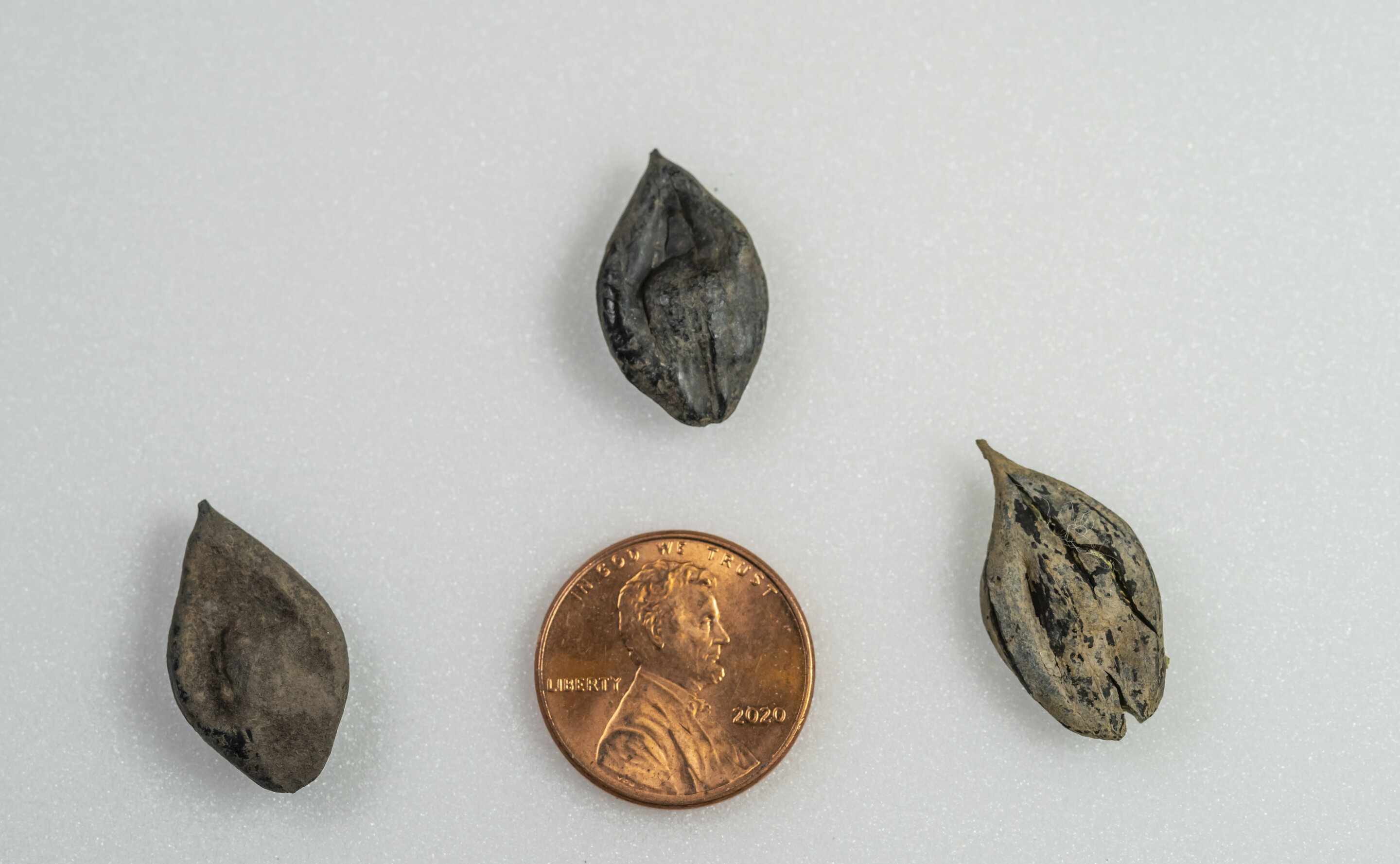 核桃已经被土壤侵蚀掉了,长在地表上。贝辛格说:“在一种情况下,核桃集中在一个地方,可能是动物在那里缓存的。”。一些坚果化石也有被啃过的洞,这表明它们是当地动物的食物来源。