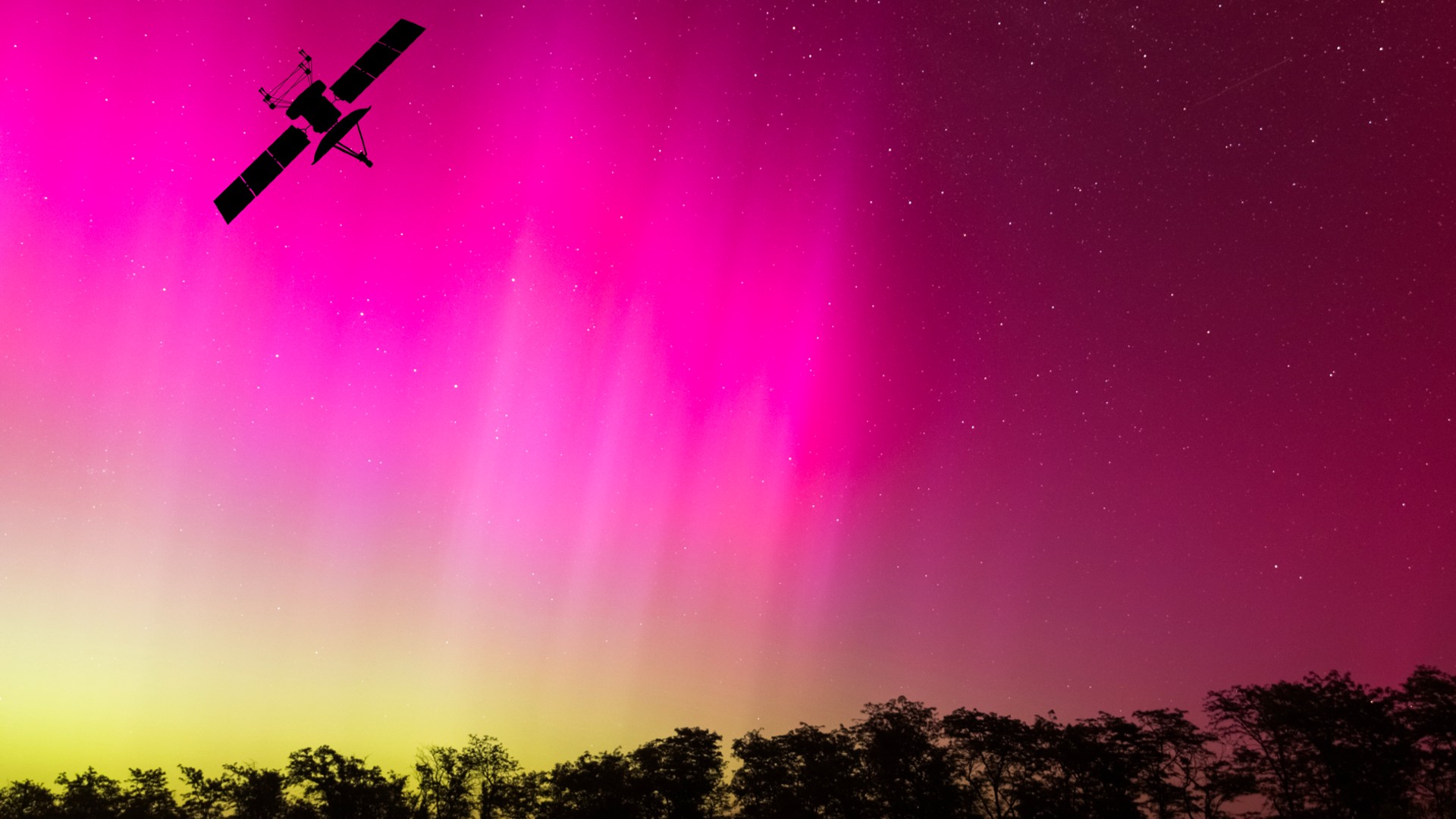 一张渲染图,显示了一颗卫星在彩色极光中的轮廓。(图片来源:uux.cn/Anton Petrus/Getty Images)