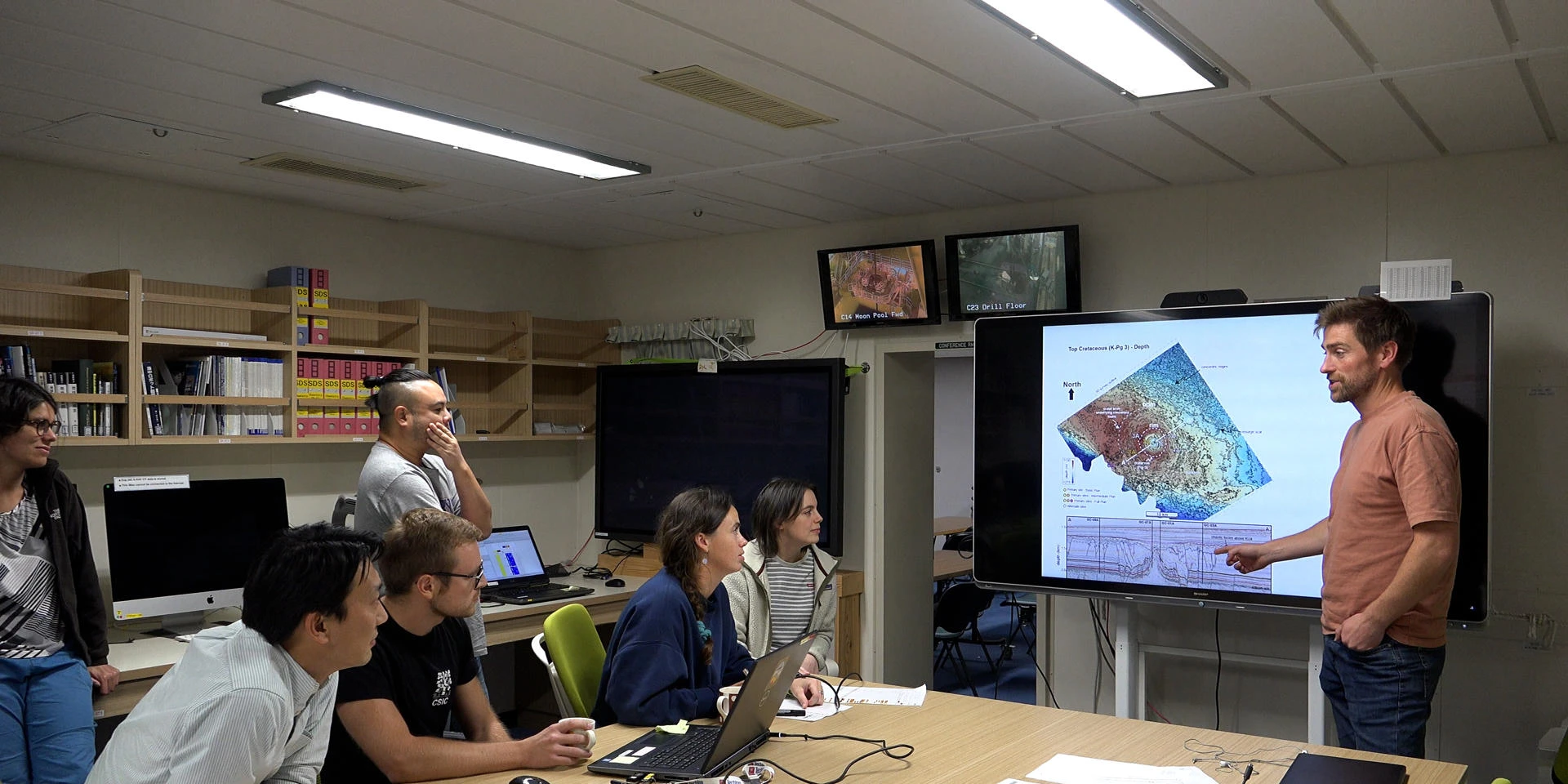 Uisdean Nicholson 博士在一艘钻井船上向科学家介绍他的发现。来源:uux.cn赫瑞瓦特大学