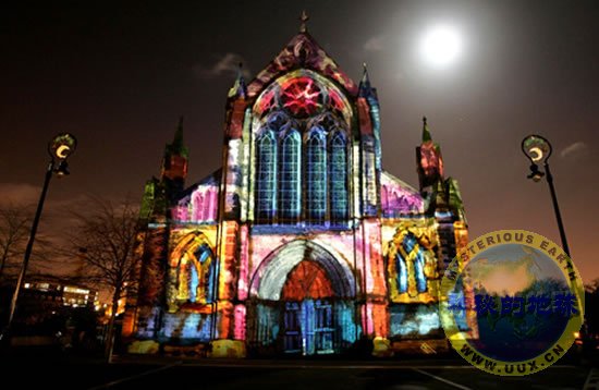 Glasgow, Scotland, United Kingdom, November 24, 2007—Glasgow Cathedral gleams during Radiance, the city's biennial International Festival of Light.