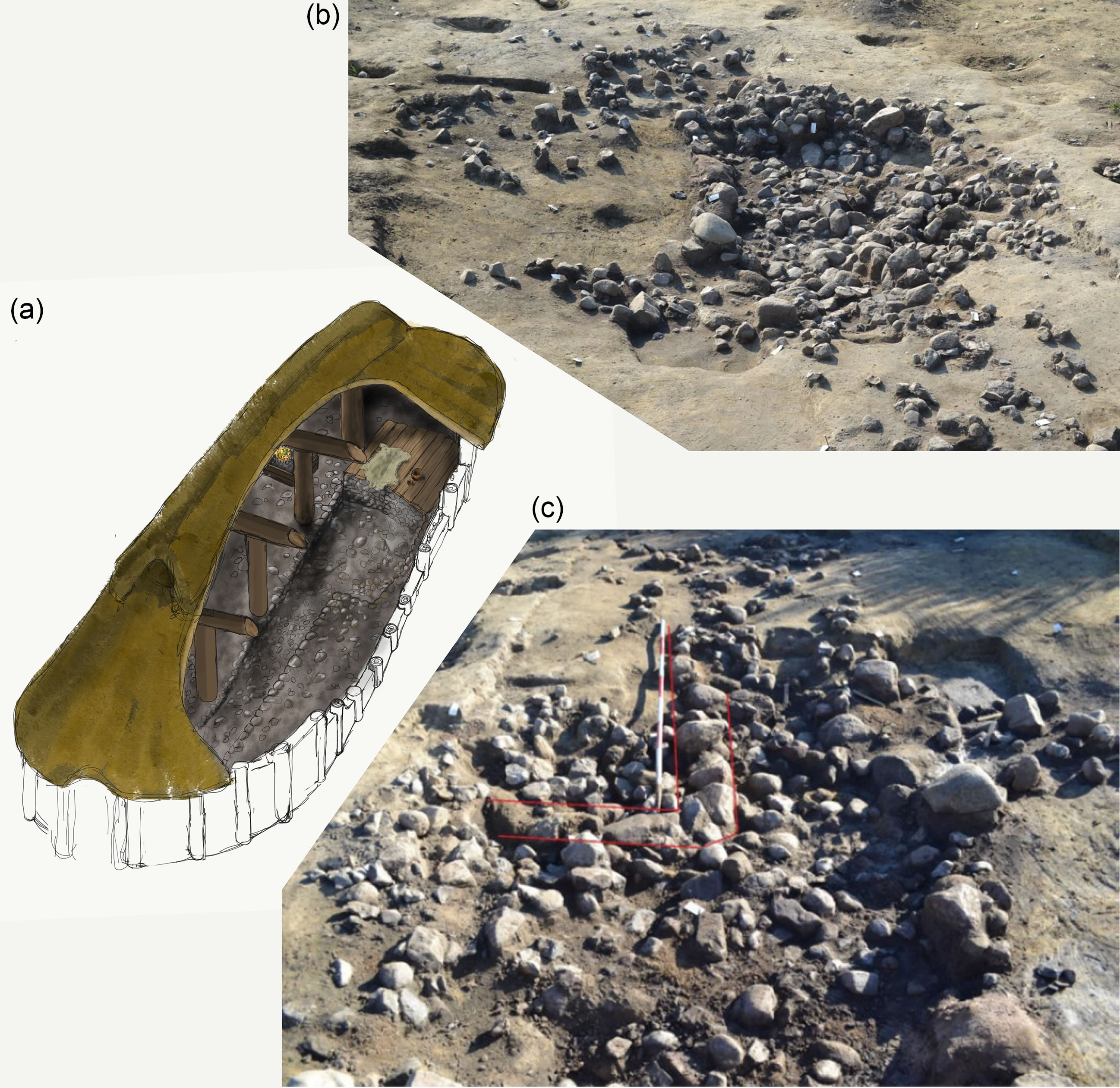 (a) 房子的重建图。(b) 地窖特征的概览照片(从东面看,方向与重建图大致相同)。(c) 地窖墙壁的细节照片,用红线标记,从西面看。绘画和照片:Lolland Falster博物馆。来源:uux.cn/Radiocarbon(2024)。DOI:10.1017/RDC.2024.79
