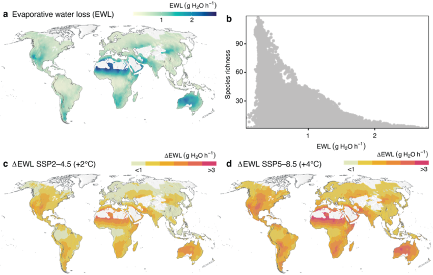 对于四个代表性生物群落中假设的 8.7 克青蛙来说,在不同气候条件下的活动变化预计将随着环境干燥而增加。图片来源:uux.cn自然气候变化 (2024)。DOI: 10.1038/s41558-024-02167-z