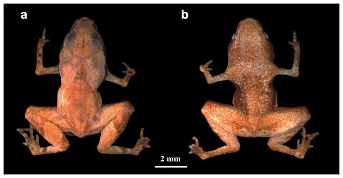Brachycephalus dacnis正型标本(ZUEC-AMP 24982)成年雄性,SVL=7.55 mm。(A)背侧视图和(B)腹侧视图。来源:uux.cn/PeerJ(2024)。DOI:10.7717/peerj.18265