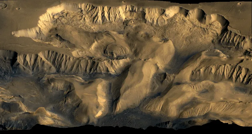维京轨道器1号和2号图像的彩色拼接显示了Candor Chasma,火星上水手谷系统的一部分。墙壁和地板显示出侵蚀和物质浪费以及复杂地貌的证据。(图片来源:uux.cn美国国家航空航天局)