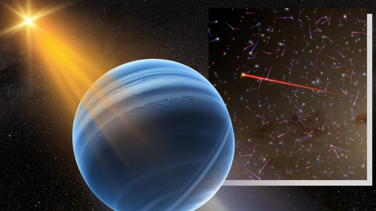 一张类似海王星的行星被其母恒星拖着穿过太空的插图,旁边是我们银河系中心附近的恒星,其彩色轨迹指示了它们的速度。轨迹越长越红,恒星移动得越快。(图片来源:uux.cn/Robert Lea(与Canva共同创作)(插图)NASA/JPL加州理工学院/R.Hurt(加州理工大学IPAC))