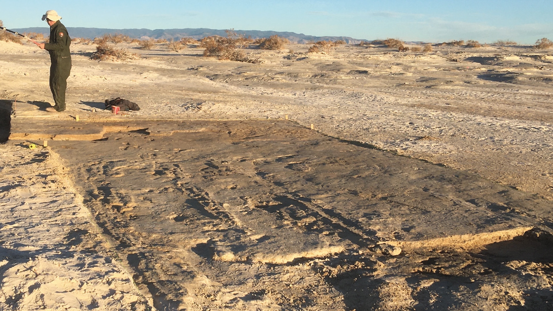 研究人员于2020年开始挖掘拖痕遗址。在白沙,铁轨保存在埋藏在沉积物下的古老干泥中。数千年前,人们与猛犸象、巨型地懒、骆驼和许多其他冰河时代的生物一起在这片土地上跋涉。