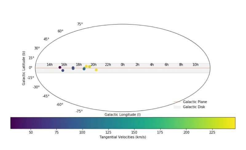 所有九个星团的天空分布图,显示了它们在银河系坐标系(经度l和纬度b)中的位置,颜色表示它们的切线速度。来源:uux.cn/arXiv(2025)。DOI: 10.48550/arxiv.2502.15114