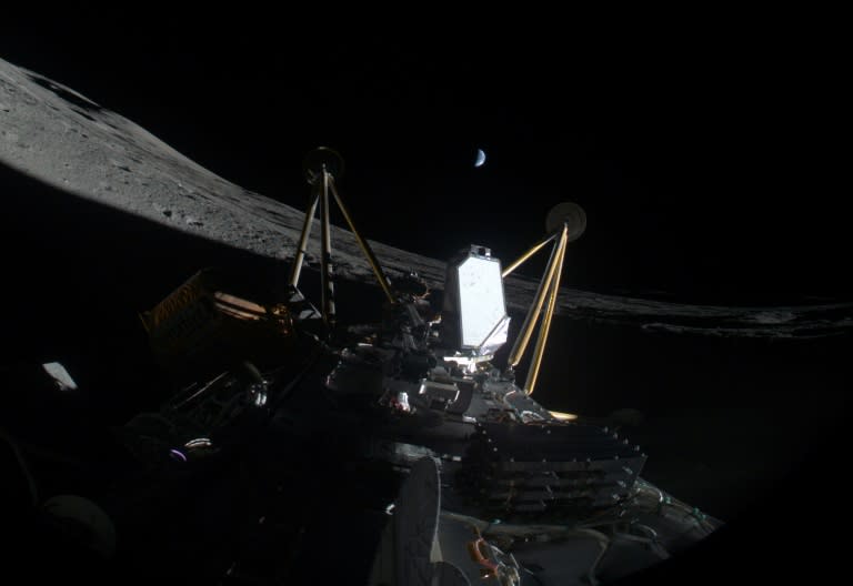 这张由Intuitive Machines LLC提供的图片显示了该公司的雅典娜航天器在2025年3月6日登陆月球后侧卧。图片:uux.cn法新社