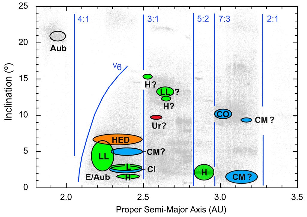 小行星带地质图。圆圈标识了我们陨石起源的小行星家族,字母标记了相应的陨石类型。水平轴的范围从小行星带内侧的短轨道(左)到外侧的长轨道(右)。垂直轴显示了小行星轨道相对于行星平面的倾斜程度。蓝线是交货共振。图片来源:uux.cn/Jenniskens&Devillepoix(2025)《陨石与行星科学》。